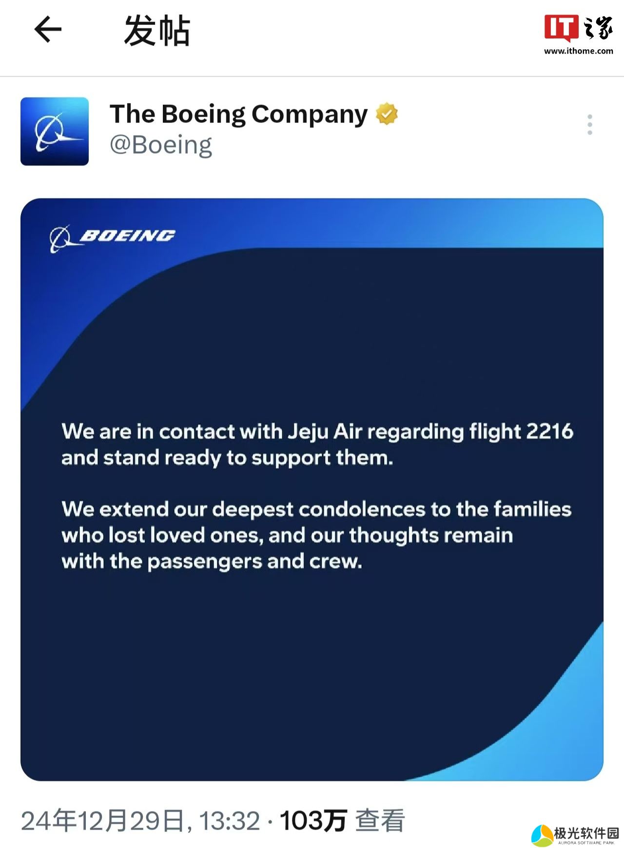 本站 12 月 29 日消息,美国波音公司今日在社交媒体上发文表示,该公司正就发生在韩国务安机场的 2216 客机航班事故与济州航空保持联系,并向遇难者家属表示慰问。本站附原文翻译如下:
