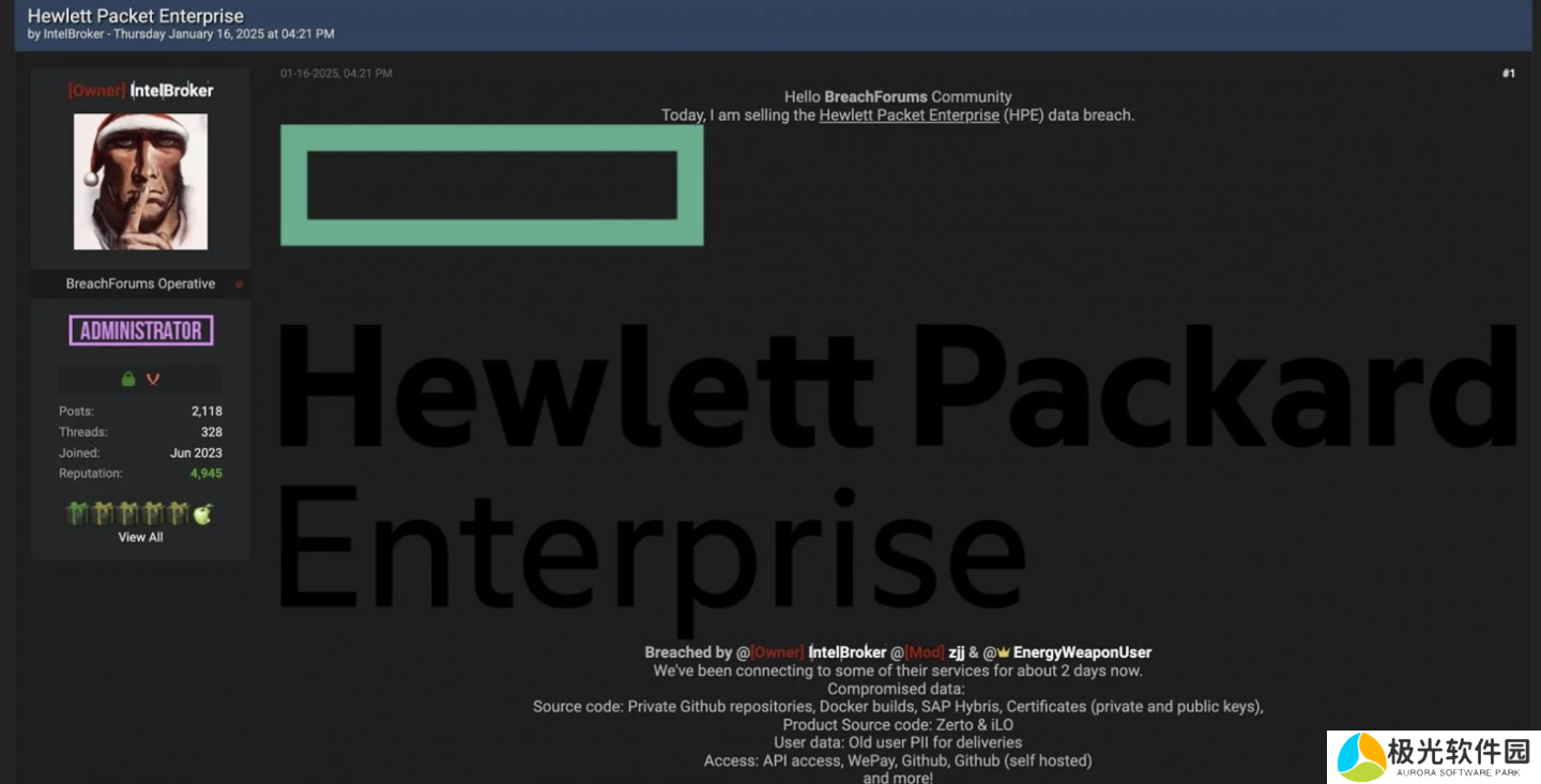 本站 1 月 24 日消息,据外媒Bleeping Computer报道,曾攻击思科、AMD 等多家知名企业的黑客组织IntelBroker,近日在地下论坛上兜售一批据称来源于慧与科技(HPE)的内部机密数据,这些数据主要包含公司内部系统凭据、软件产品源代码等。