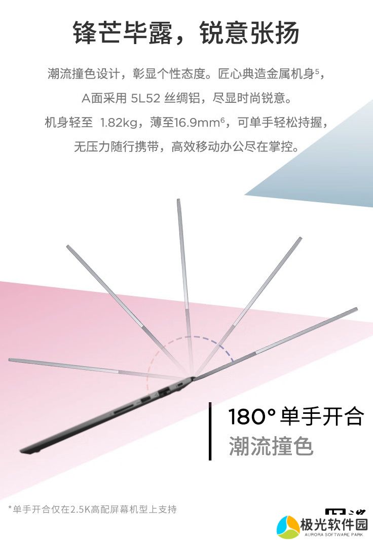 该机A面采用5L52丝绸铝,机身整体重量1.82千克,厚度为16.9mm,笔记本支持180度单手开合,机身内置71 WHr电池。