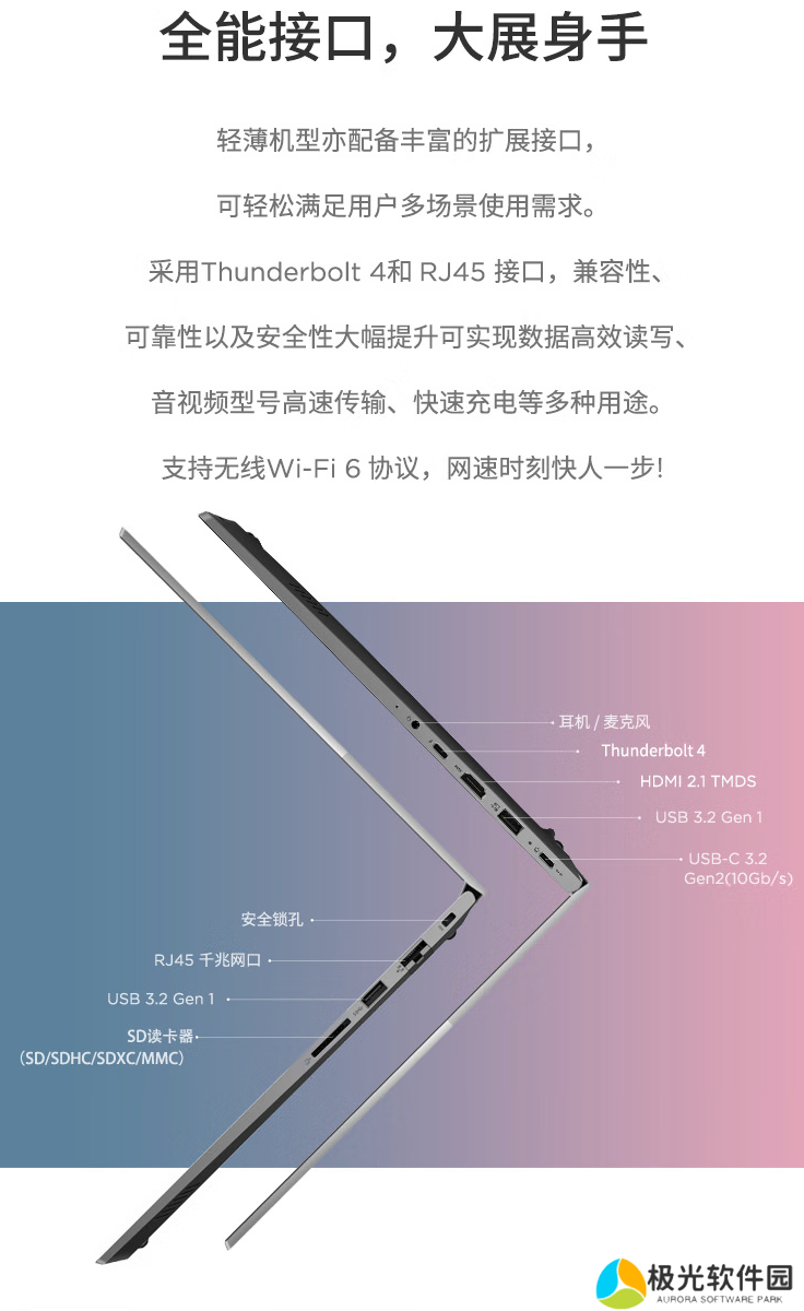 接口方面,该机左侧配备1个RJ45接口、1个USB-A 3.2 Gen 1接口、1个SD卡读卡器;右侧配备1个 3.5mm音频接口、1个雷电4接口、1个HDMI 2.1接口、1个USB-A 3.2 Gen 1接口、1个USB-C 3.2 Gen 2接口。