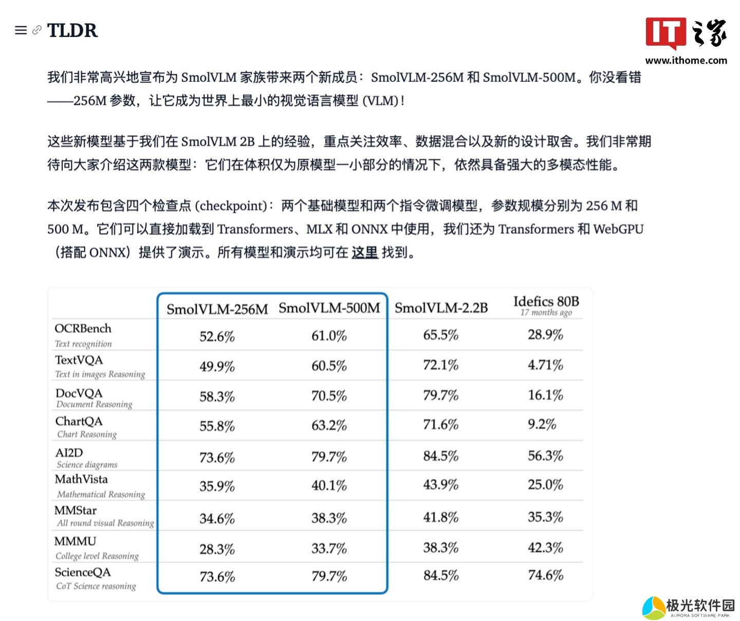 据悉,相应模型主要基于 Hugging Face团队去年训练的 80B参数模型蒸馏而成,号称在性能和资源需求之间实现了平衡,官方称 SmolVLM-256M / 500M 两款模型均可“开箱即用”,可以直接部署在transformer MLX和ONNX平台上。