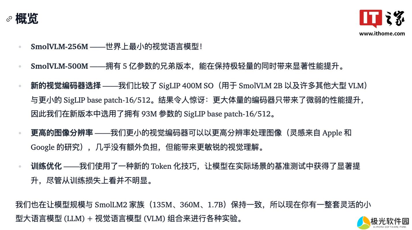 本站 1 月 26 日消息,Hugging Face 发布了两款全新多模态模型SmolVLM-256M和SmolVLM-500M,其中SmolVLM-256M号称是世界上最小的视觉语言模型(Video Language Model)。