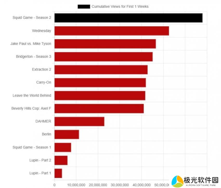 从单周收视来看,这仅次于《鱿鱼游戏》10 月第一周(2021 年 9 月 27 日至 10 月 3 日)创下的 5.7176 亿小时纪录,位居第二。按收视地区来看,该剧登顶美国、法国、日本、印度、澳大利亚等 92 个国家和地区榜。