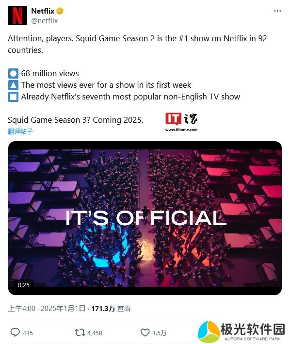 本站 1 月 2 日消息,Netflix 热播剧《鱿鱼游戏》第二季自 2024 年 12 月 26 日上线以来,取得了巨大成功,首周全球观看次数已达 6800 万,总观看时长为 4.876 亿小时,刷新前作于 2021 年 9 月第四周(20 至 26 日)创下的 4.4873 亿小时的纪录。