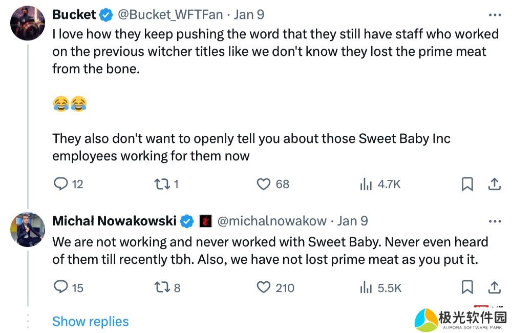 而 Michal Nowakowski 在回复中坚决否认了这一说法:“CDPR现在并没有跟 Sweet Baby 进行合作,以前也从来没有过。说实话,直到最近我才听说过他们!”