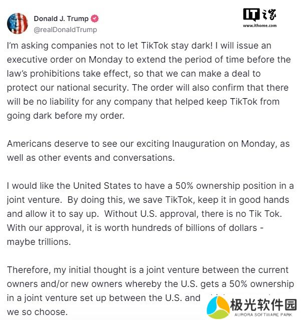 据本站昨日报道,美国当选总统特朗普在社交媒体发文称,将于周一(1 月 20 日)发布一项行政命令,延长 TikTok 禁令法定生效前的时限。他还称,在行政命令下达前,任何协助 TikTok 避免关停的公司都无需承担责任。特朗普另外表示,为了“拯救 TikTok”,他希望美方“能在未来的合资企业中拥有 50% 的所有权”。