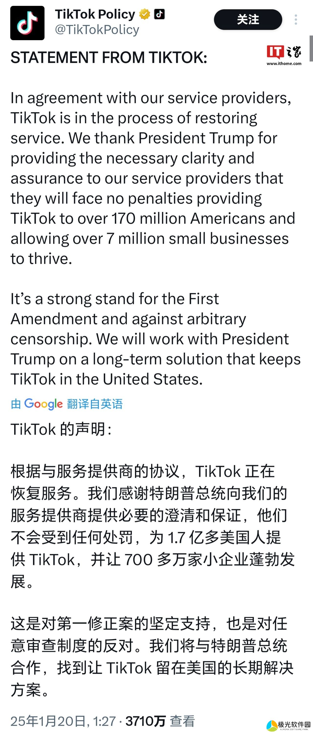 本站 1 月 20 日消息,当地时间 1 月 19 日,TikTok 在社交媒体平台 X 上发表声明:正在恢复对美国用户的服务,并将与美国候任总统特朗普合作制定一项长期解决方案,让 TikTok 继续“留在美国”。