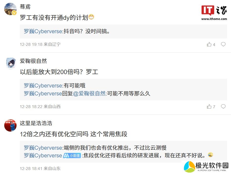 罗巍还在评论区中回复了部分网友的问题:针对荣耀手机以后是否会支持放大至 200 倍,他表示“有可能哦”;针对 12 倍以内长焦的后续优化计划,他称“端侧的我们也会有优化推出,不过比云测慢”。