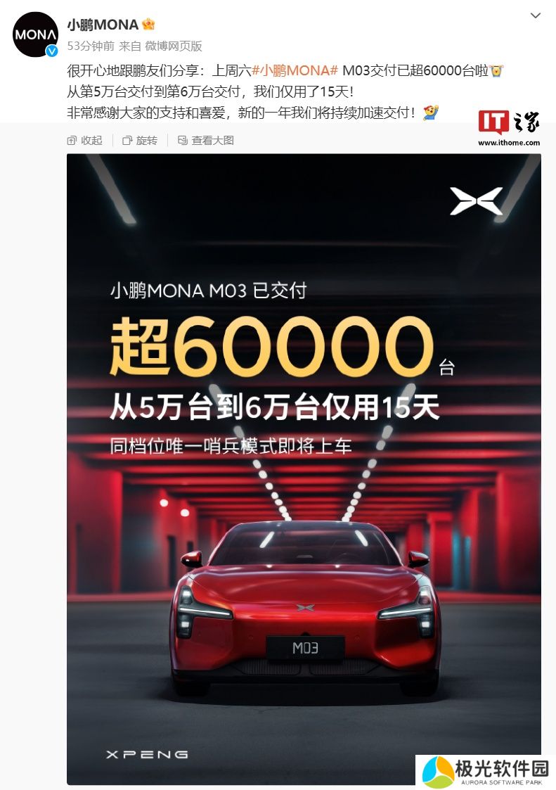 据本站此前报道,小鹏 MONA M03 汽车本周(1 月 20 日)官宣交付超 6 万台,同时第 5 万台交付到第 6 万台交付用时 15 天。