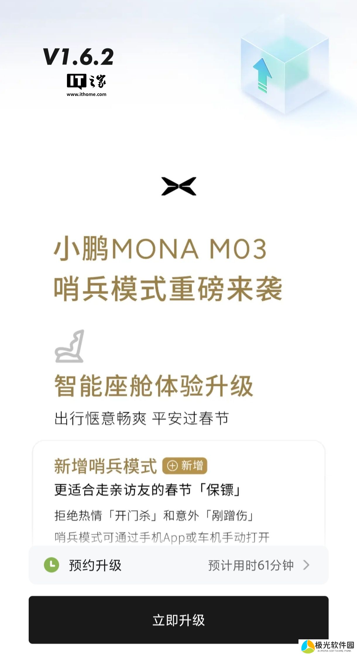 本站 1 月 23 日消息,小鹏 MONA M03 汽车现获 V1.6.2 版本升级,该版本主要新增支持哨兵模式、备用 4G 网络等功能。