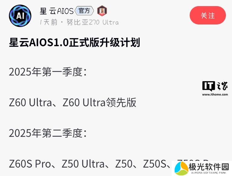 本站 1 月 13 日消息,中兴通讯于 2024 年 11 月推出星云 AIOS,由努比亚 Z70 Ultra 首发搭载。据本站网友反馈,努比亚星云 AIOS1.0 正式版升级计划现已公布。